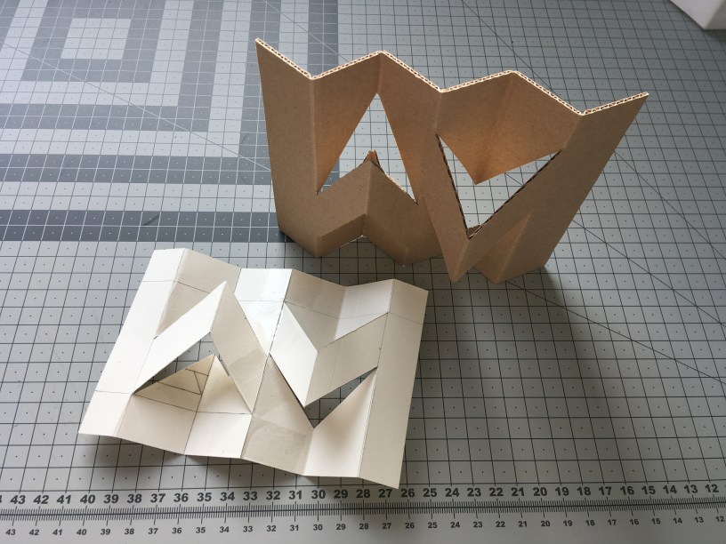 Teen erilaisia muotokokeiluja aaltopahvista. Tarkoituksena on löytää pinoutuvia rakenteita, joita on mahdollista jalostaa edelleen pakkauksiin. Samalla pyrin avaamaan muotoiluprosessia, vaikka prosessi sanana luo mielikuvan jostain vaiheittain etenevästä tapahtumaketjusta, jota muotoilijan työ ei useinkaan ole.